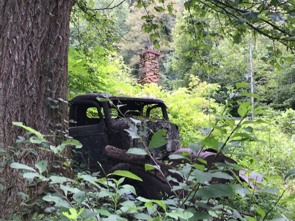 My brother and I follow the trail several hundred feet farther until it disappears into the thicket before turning back toward the top of the hill. After a quick lunch at the campsite, we head down the other branch of the trail. We come up on a lone chimney standing in a thicket of oak and maple, several house foundations, stone walls, and even a ruined 1930s-era pick up truck.